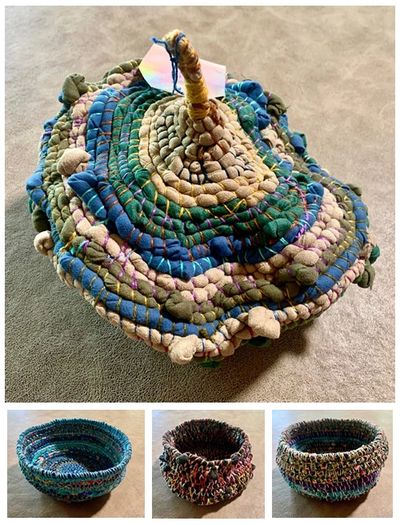 Students will explore making coiled fabric baskets using two basic techniques. Light weight fabric wrapped around a core cloth wrapped and stitched with a thin binder material and/or