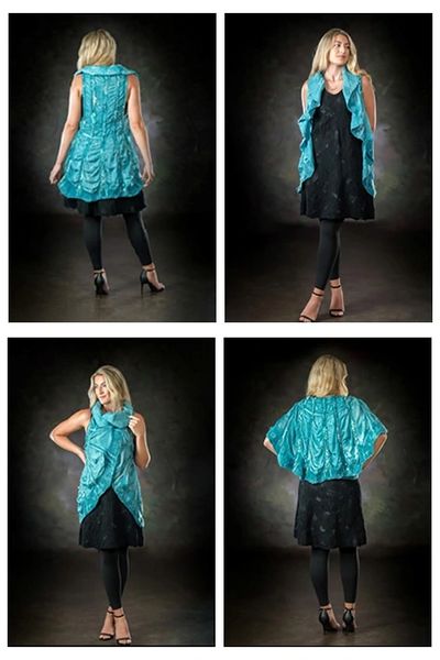 The Circle Vest is flattering because of the curve at the lower back and a versatile vest because It can be worn 4 different ways. Participants create a vest in colors of their choice. This is a one day class. Students will be able to discuss their color choice with Patti via email.